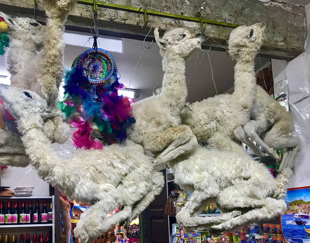 PS 2: Täältä La Pazin toreilta voivat taikauskoisimmat ostaa kuivattuja laman sikiöitä varmistamaan, että äiti maa pitää asiat kunnossa. Hurjan näköisiä myyntitiskejä!